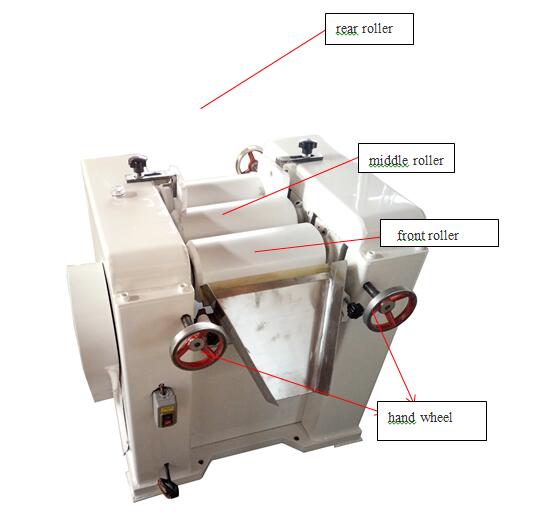 اس سامان میں فریم پر مقرر کردہ تین رولر مشتمل ہوتے ہیں اور موٹر کی طرف سے براہ راست کام کر رہے ہیں. رولر کے درمیان گردش کی سمت عام طور پر مختلف ہے، سامنے رولر آگے بڑھ جاتا ہے جبکہ پیچھے رولر پیچھے گھومتا ہے. سامنے رولر کی رفتار تیز ہے جبکہ پیچھے پیچھے کی رفتار تیز ہے. درمیانی رولر مقرر کیا گیا ہے، اور بہار آلہ کے ساتھ سلائڈ پر سامنے اور پیچھے رولرس نصب کیے جاتے ہیں. ہاتھ پہیا ایڈجسٹ کرکے تین رولرس کے درمیان فاصلے کو ایڈجسٹ کریں. پیچھے رولر اور مشرق رولر کے درمیان خلا سے خارج ہونے والی مواد، رولروں کی طرف سے چھوٹے ذرہ سائز حاصل کرنے کے لئے نکالا جاتا ہے. اس کے بعد مواد کو تیز رفتار (رول کی تیز رفتار پر گھومتا ہے) کی طرف سے پھینک دیا جاتا ہے. روٹری رولر الگ الگ مواد کو رولر اور زوال سے جمع کرنے والی بیرل میں اختتام پر سکریپپر. چونکہ یہ پیسنے والی عمل میں بہت گرمی پیدا کرتا ہے، ہر رولر کا مرکز کھوکھلی ہے. اچھے معیار کے ساتھ تیار مصنوعات کو یقینی بنانے کے لئے کولنگ کے لئے ان پٹ پانی.